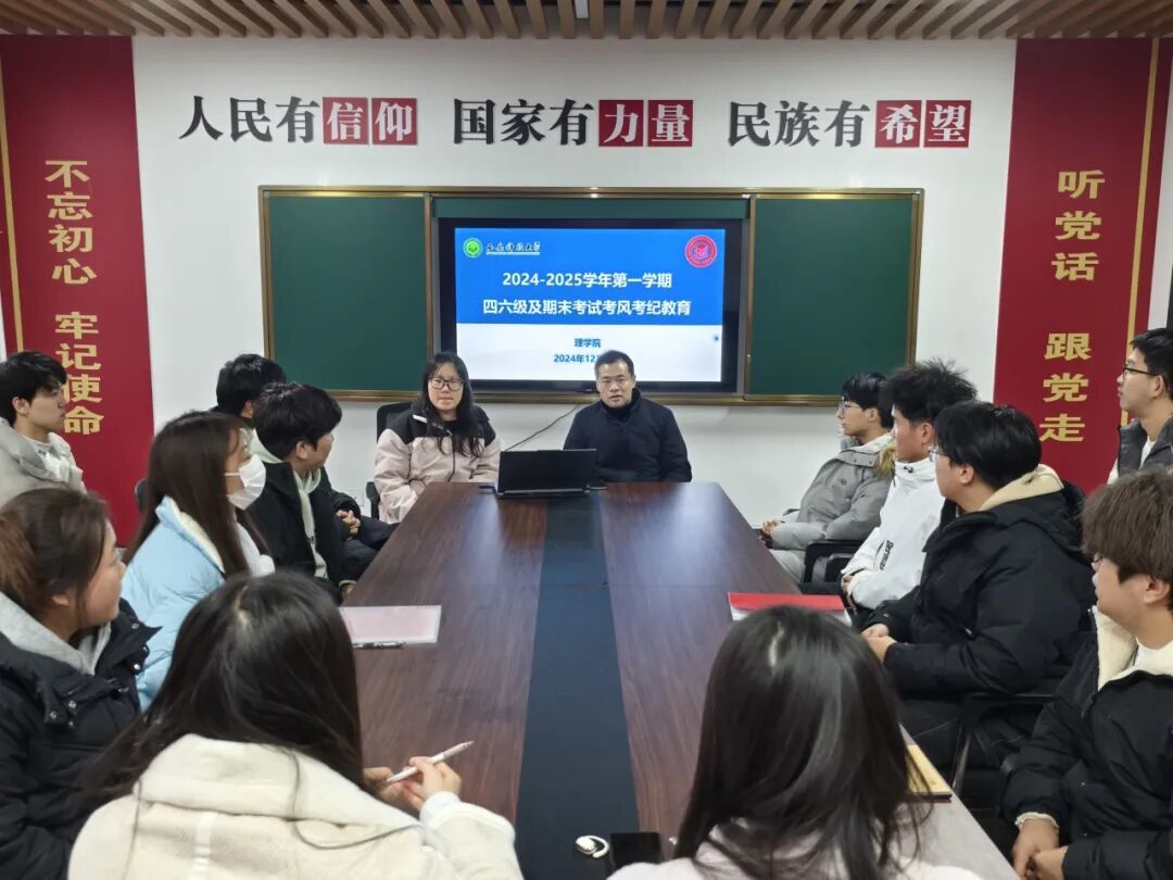 为营造优良学风,严肃考风考纪,助力学生学业提升与个人成长,确保四六级考试及期末考试顺利进行,12月12日,理学院于一站式社区召开了英语四六级及期末考试考风考纪教育会议,本次会议由院学工办主任侯斌刚和2024级辅导员薛一丹主持,2023级和2024级各班班长、团支书、学习委员参加。