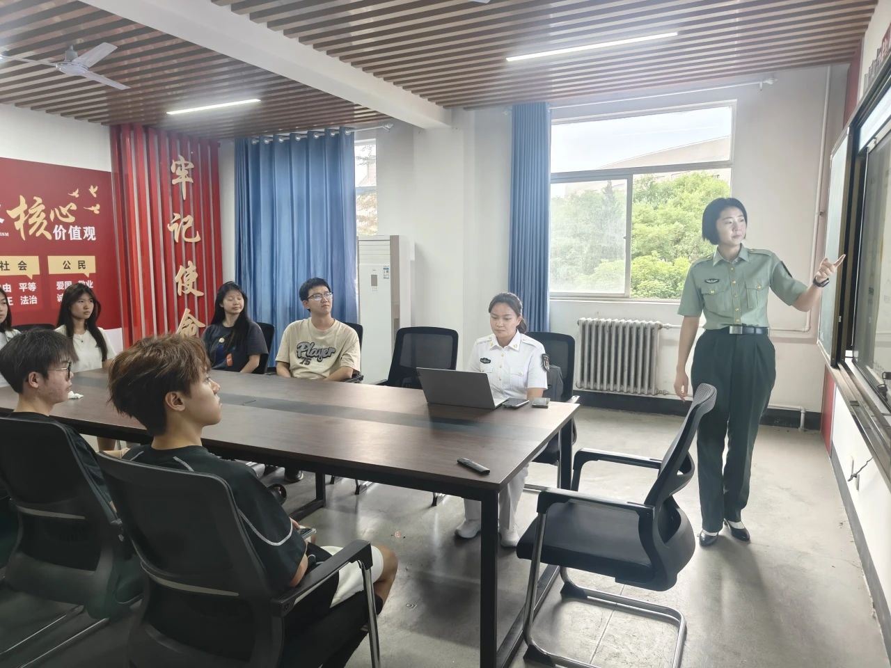 她们结合服役期间拍摄的影像资料,从“军营成长轨迹”“科技强军实践”“战友情深记忆”三个维度展开分享,并结合流程图,直观呈现大学生参军“报名-体检-政审-定兵”全流程,重点标注学籍保留、学费补偿、考研加分等优惠政策。针对学生关注的“军营适应期”“专业技能发展”等问题,以时间轴形式展示新兵训练、岗位分配、晋升路径等关键节点,用亲身经历破除“军营生活神秘化”的认知误区。