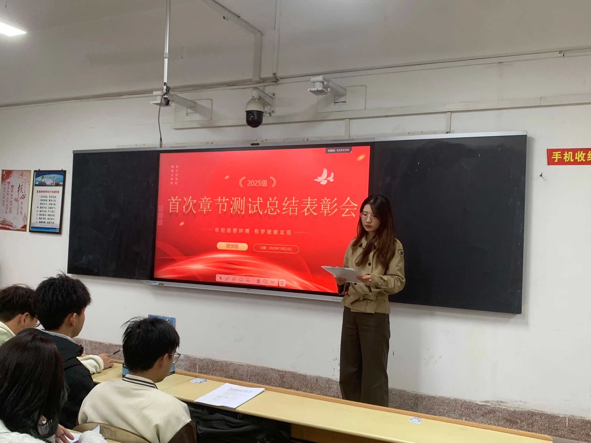 为对开学以来的学习情况进行阶段性总结,激励全体同学共同进步,10月23日,理学院于3-207教室举办了2025级首次章节测试总结表彰会。会议由2025级辅导员段佳主持,院党委副书记陈伟伯和2025级全体本科生参加活动。