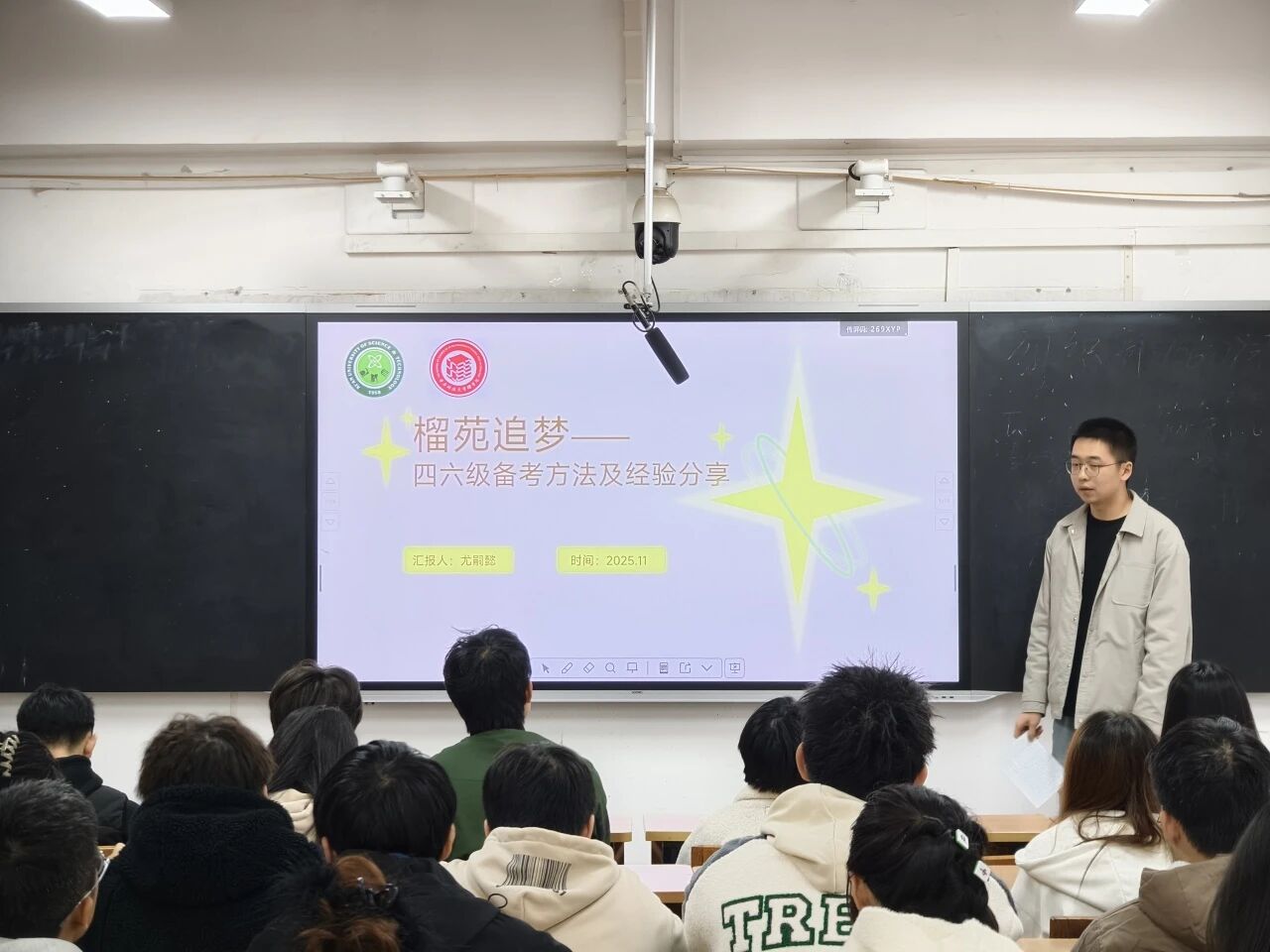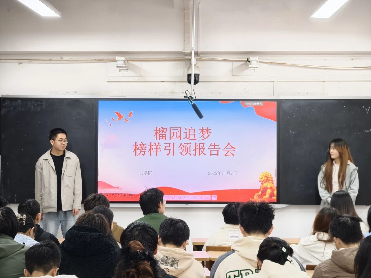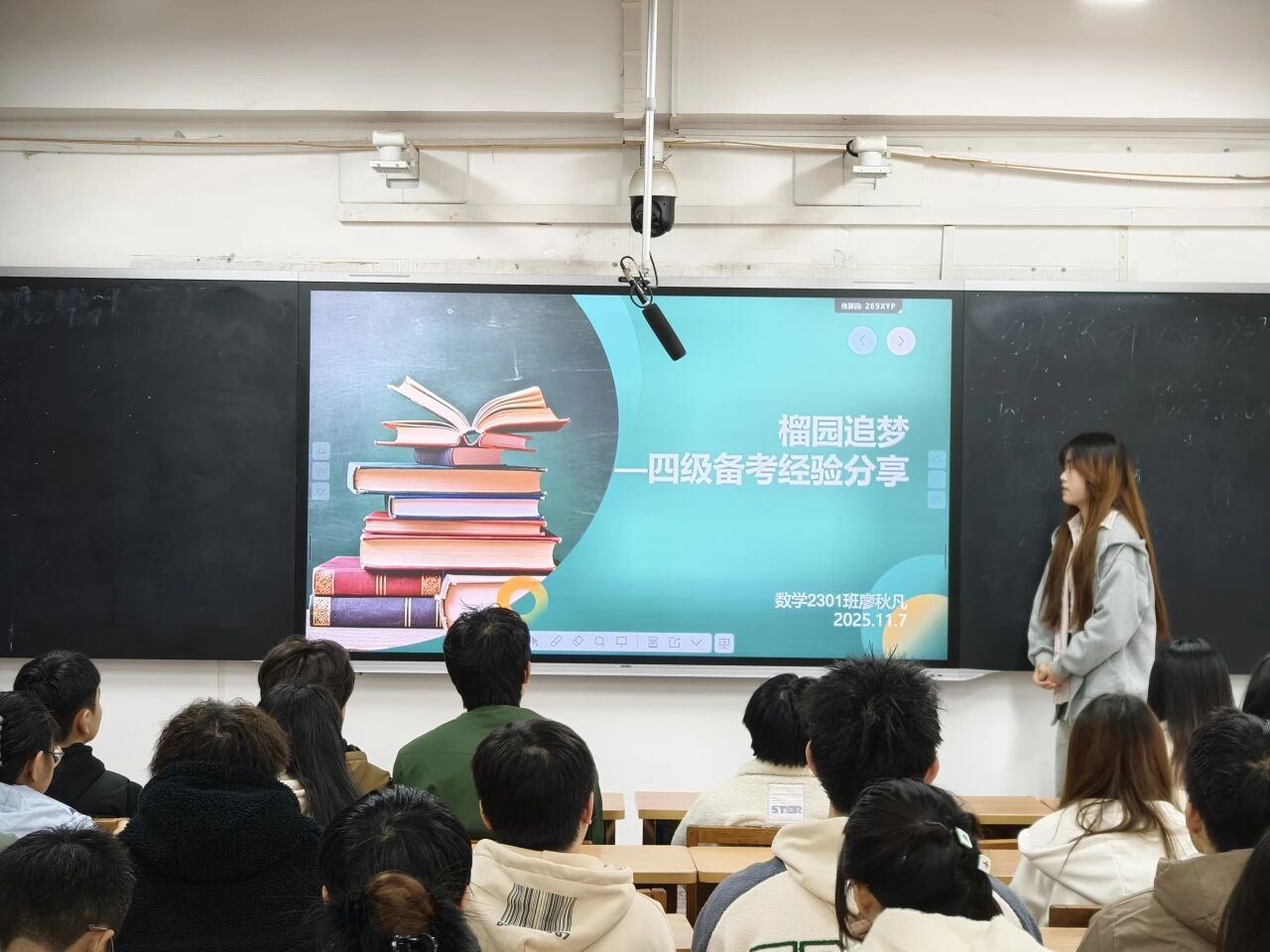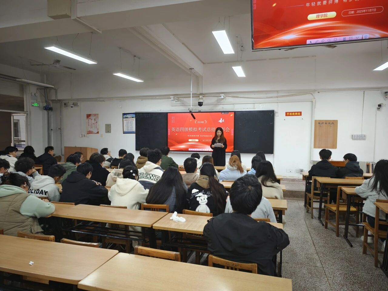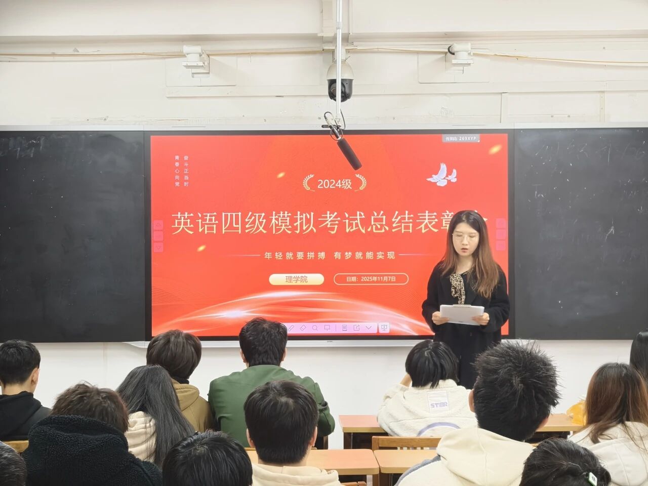 为总结备考经验,表彰先进典型,激发学习热情,11月7日,理学院于3-513教室举办了2024级英语四级模拟考试总结表彰会暨“榴园追梦”榜样引领报告会。会议由2024级辅导员段佳主持,院团委书记侯斌刚及2024级全体本科生参加。