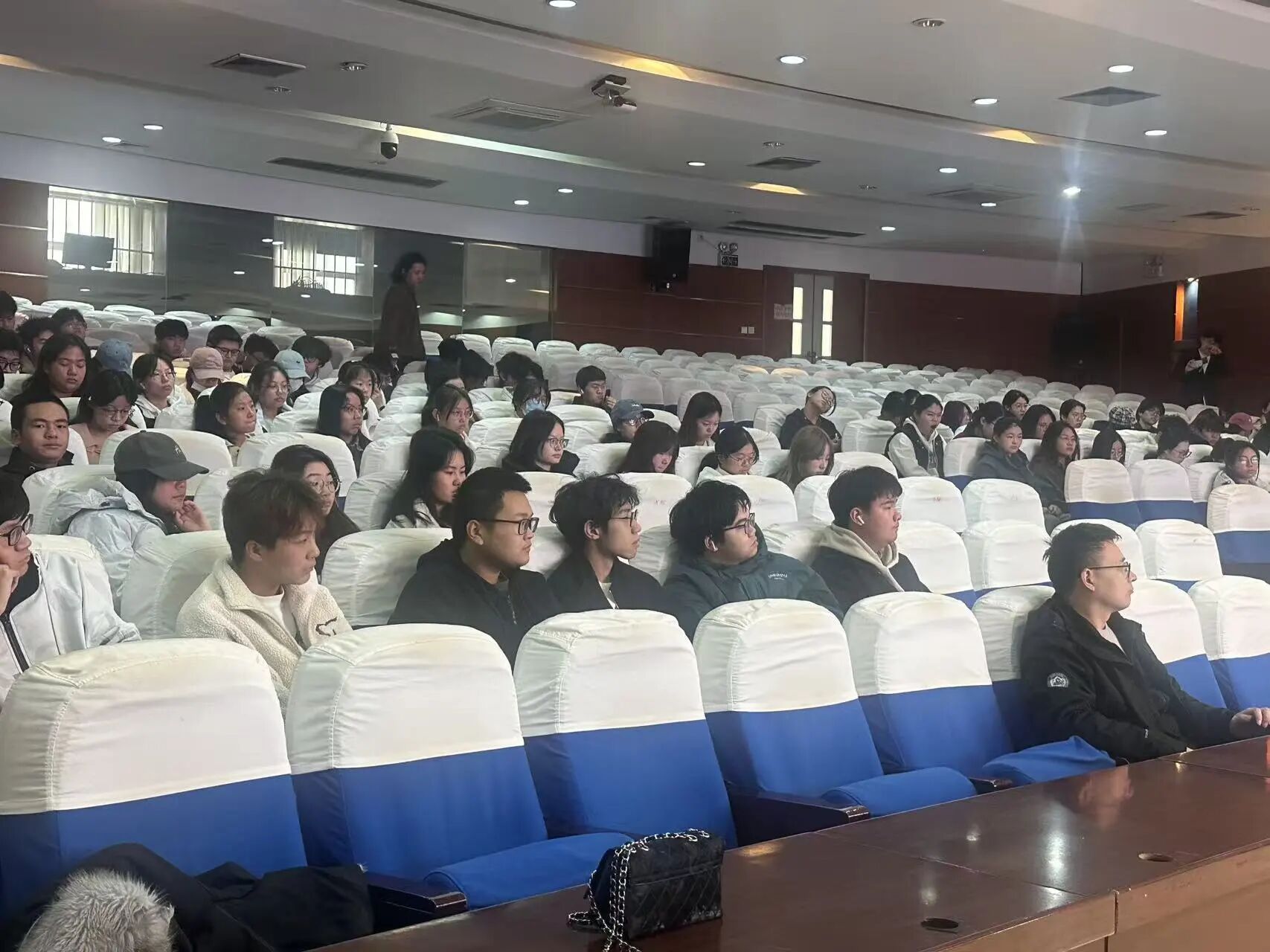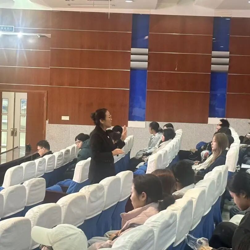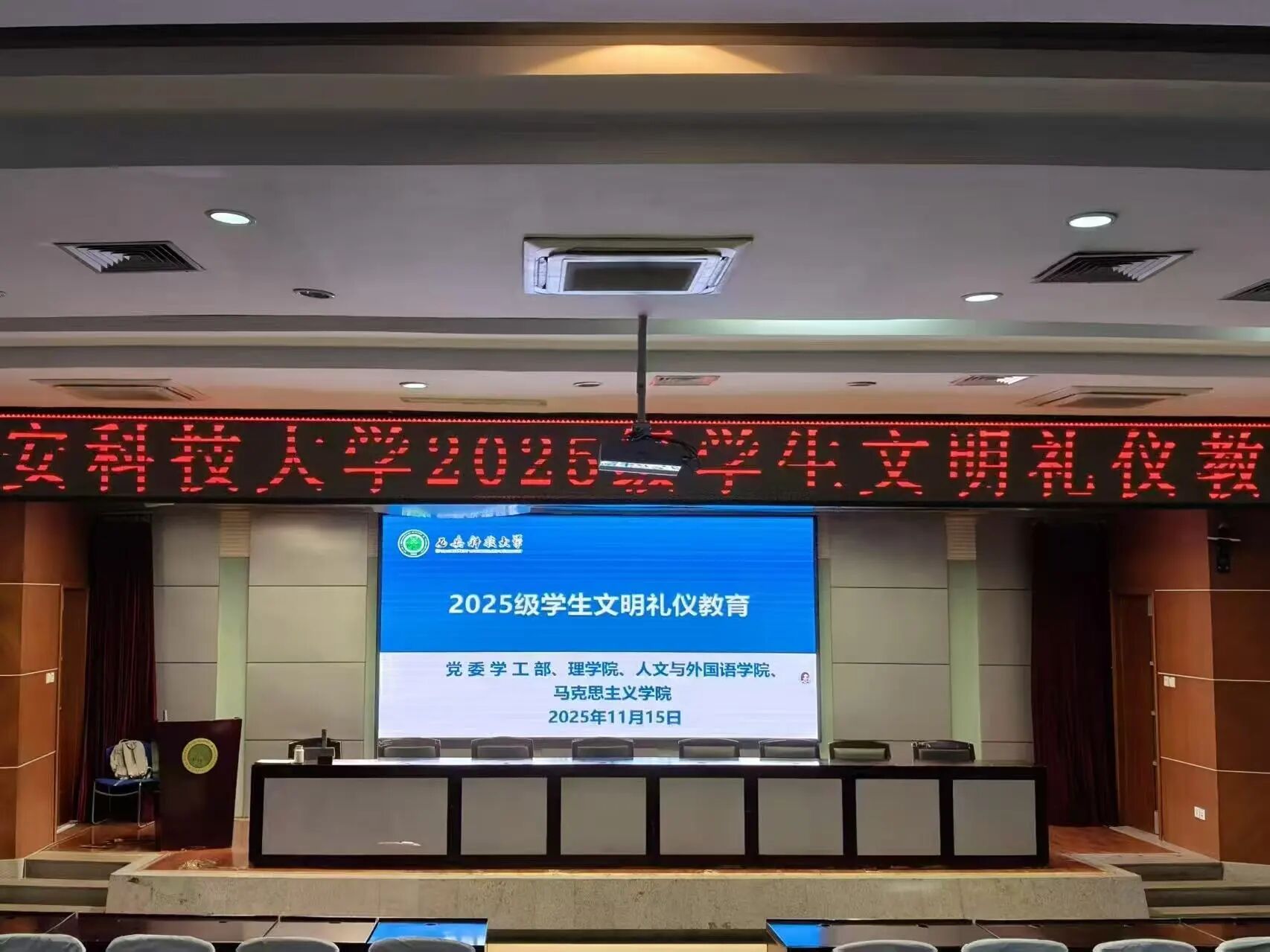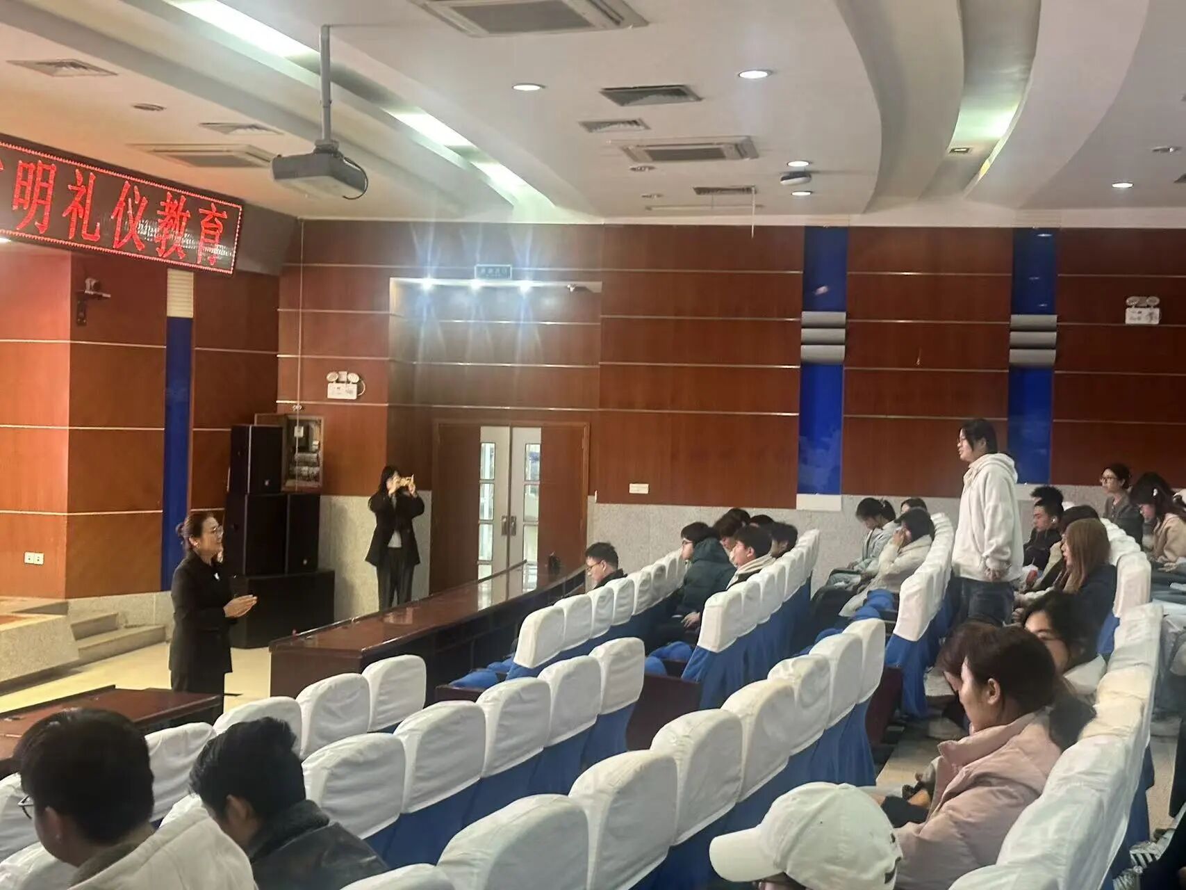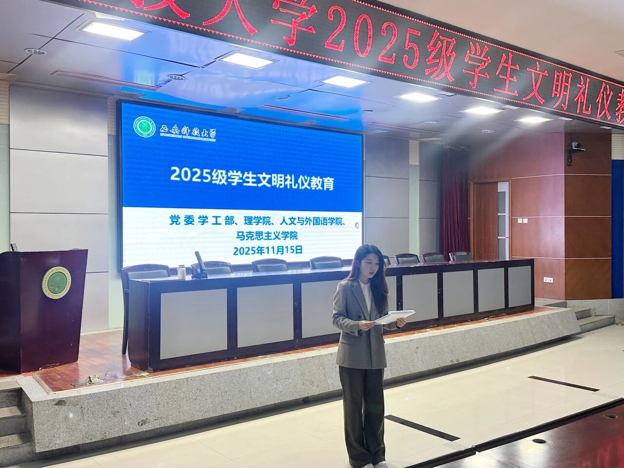 为进一步做好新生入学教育,提升学生文明修养和综合素质,11月15日,理学院等三家学院于图书馆二楼报告厅共同参加了学校举办的2025级学生文明礼仪教育活动。本次活动由礼仪培训师马克伟主讲,理学院2025级辅导员段佳主持,学工部白生宝、人文与外国语学院辅导员李银亮和理学院、人文与外国语学院、马克思主义学院全体2025级学生参加。