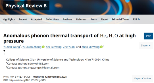 王乙先副教授与王朝棋副教授团队在高压物理研究领域取得重要进展。其关于高压下He2H2O异常声子热输运行为的研究成果,以“Anomalous phonon thermal transport of He2H2O at high pressure”为题发表于凝聚态物理领域权威期刊《Physical Review B》(自然指数期刊)。该成果由王乙先副教授担任第一作者,2023级硕士研究生张宇轩为第二作者,王乙先、王朝棋副教授共同担任通讯作者,西安科技大学为唯一通讯单位。研究揭示了氦-水化合物在高压下的异常声子热输运机制,其显著的声子热传输抑制效应可能会改变冰巨星深层的电导分布和抑制氢-氦相分层,为解释冰巨星内部的多极磁场与异常热流,以及理解其动力学过程与热演化历史提供了关键理论依据。