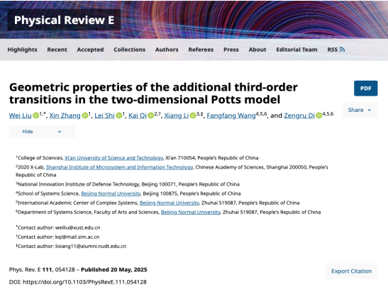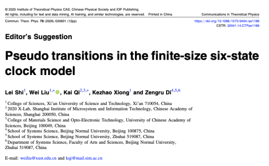刘伟副教授与熊科诏副教授团队在复杂系统临界态预警的基础理论研究方面取得重要进展。相关研究成果以系列论文形式分别发表于统计物理领域权威期刊《Physical Review E》、《Physics Letters A》和《Communications in Theoretical Physics》,包括题为“Geometric properties of the additional third-order transitions in the two-dimensional Potts model”,“Pseudo transitions in the finite-size Blume-Capel model”及“Pseudo transitions in the finite-size six-state clock model”的三篇论文,其中第三篇论文入选编辑推荐论文。该系列研究工作由西安科技大学、中国科学院上海微系统与信息技术研究所、中国人民解放军军事科学院及北京师范大学共同合作完成。刘伟副教授与其指导的硕士研究生石雷分别为论文的第一作者,西安科技大学为第一作者单位及共同通讯作者单位。研究揭示了复杂系统在临界区外侧所展现的普适性行为,构建了用于刻画该类行为的新序参量,并提出了一种针对临界相变的早期预警方法。该方法在活性物质体系与人工集群系统等领域具备潜在应用价值,同时也为复杂工业系统中的临界灾害预警研究提供了新的理论支撑。