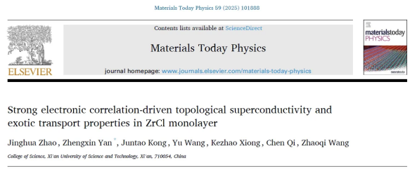 炎正馨教授团队聚焦拓扑器件核心材料研发,在ZrCl单层材料研究中取得重要突破。相关成果以“Strong electronic correlation-driven topological superconductivity and exotic transport properties in ZrCl monolayer”为题,发表于材料科学与应用物理交叉领域TOP期刊《Materials Today Physics》(影响因子9.7)。该成果由2023级硕士研究生赵京华担任第一作者,炎正馨教授为通讯作者,西安科技大学为唯一通讯单位。研究揭示了ZrCl单层材料中强电子关联、拓扑保护与晶格动力学的深度耦合,明确强关联驱动是其非常规拓扑超导态的核心成因。该态具有稳定超导能隙和可控边缘模,为智能超导量子器件奠定基础。其鲁棒的拓扑边缘模可保持量子演化高相干性,显著降低信息传输损耗,为高保真容错量子比特提供新范式,适用于可扩展量子计算芯片。材料的低散射、低能耗电子输运特性使其成为零损耗互连、超低功耗逻辑单元及量子传感器的理想载体,可优化未来信息与能源体系的能耗效率。强关联-超导-拓扑效应的协同调控机制,为自旋电子器件、拓扑晶体管及量子控制组件提供工程化路径,助力我国在量子芯片与前沿信息技术领域占据引领地位。