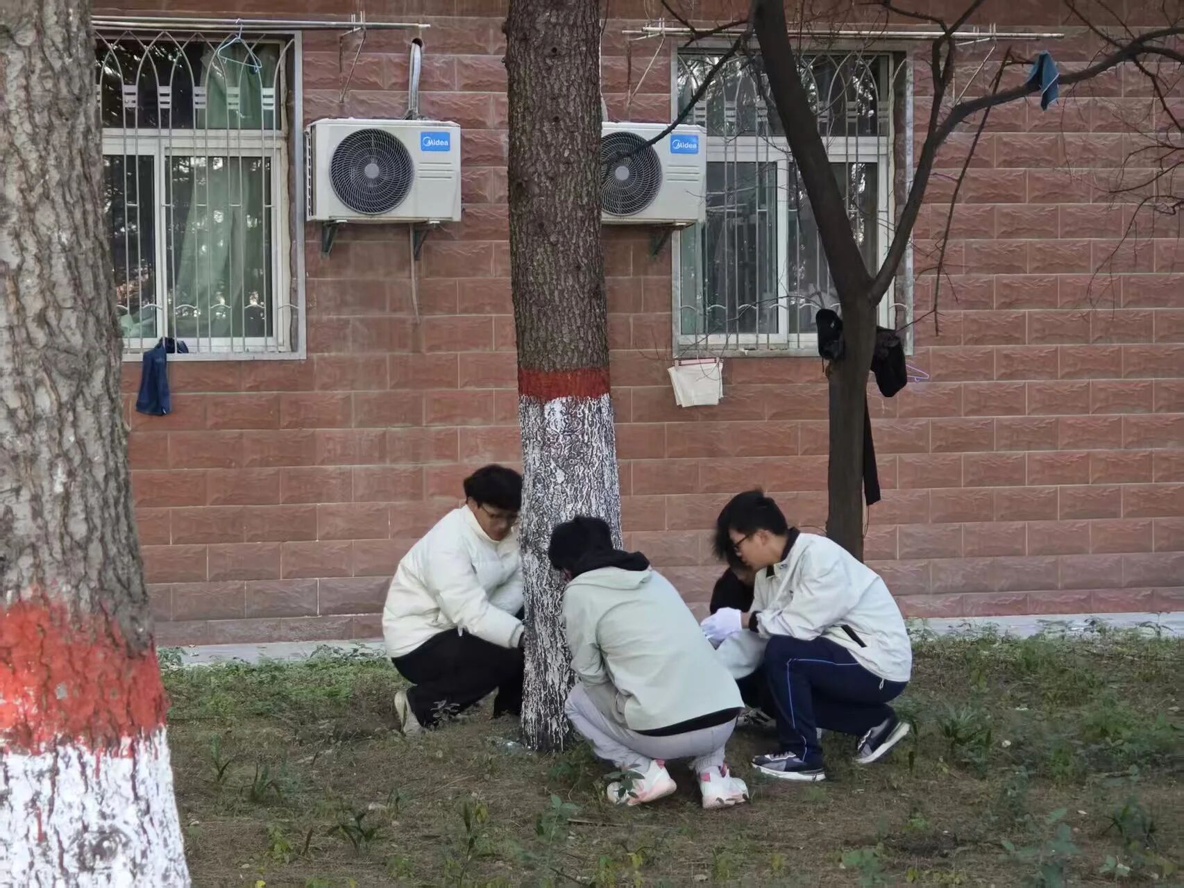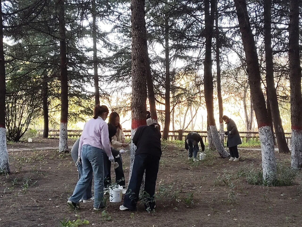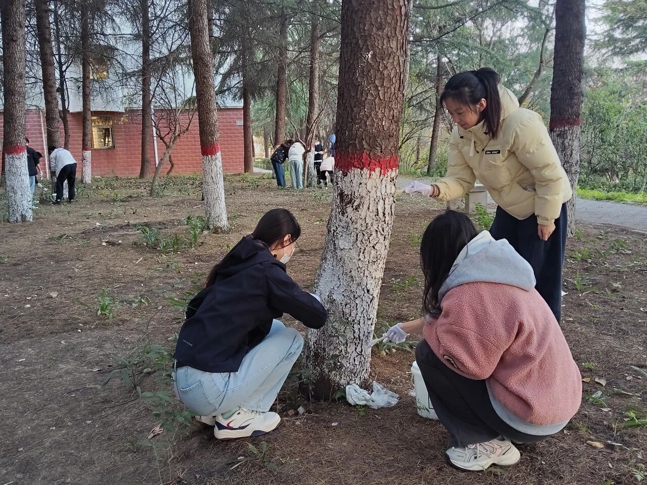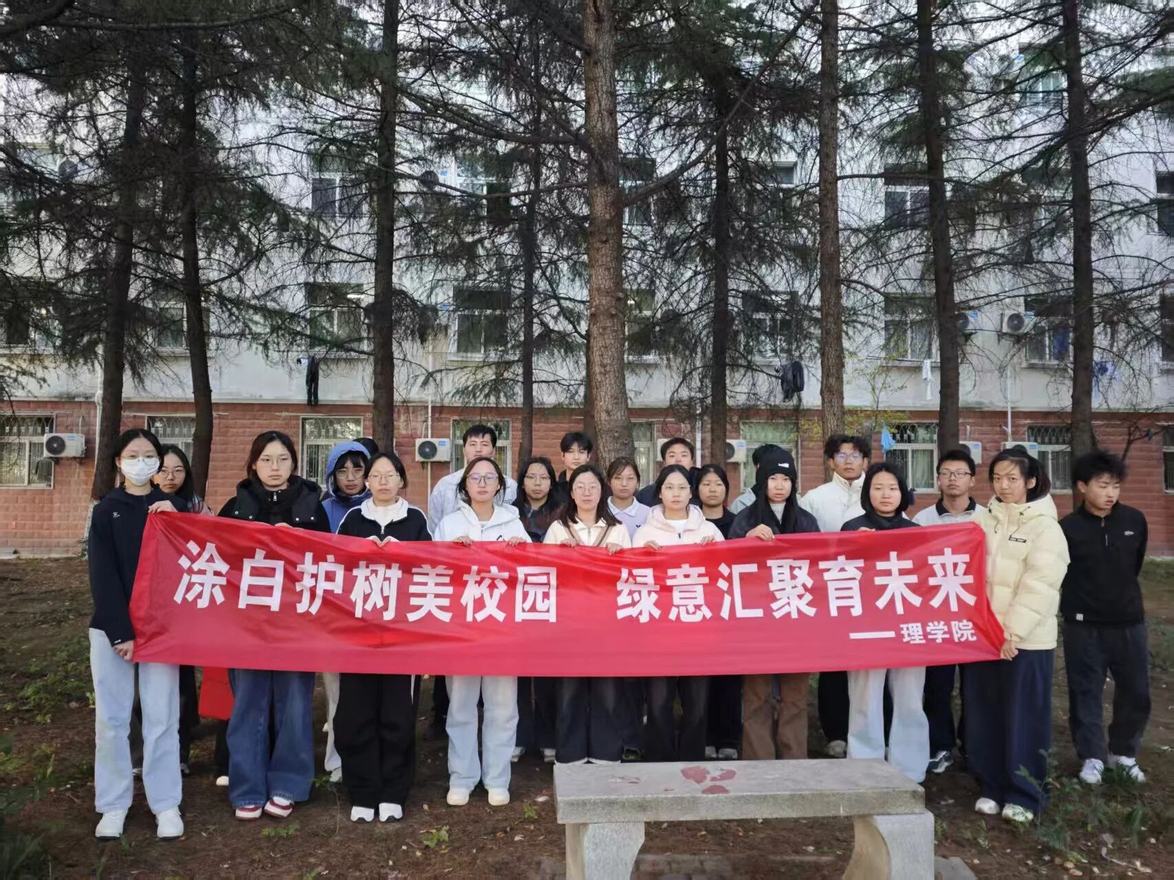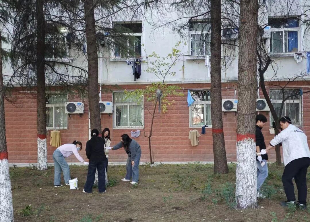 在承载着学院历史与校友深情的力学77级纪念林,同学们的工作更增添了一份庄重的仪式感。大家怀着对前辈学长的敬意,一丝不苟地为这片具有特殊意义的林木进行养护。一刷一刷之间,不仅是为树木筑牢了防护屏障,也仿佛是在触摸和传承学院厚重的精神文脉。