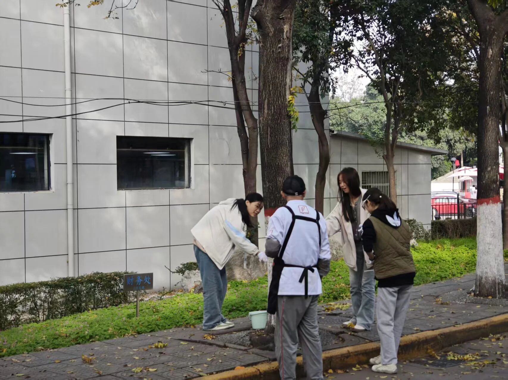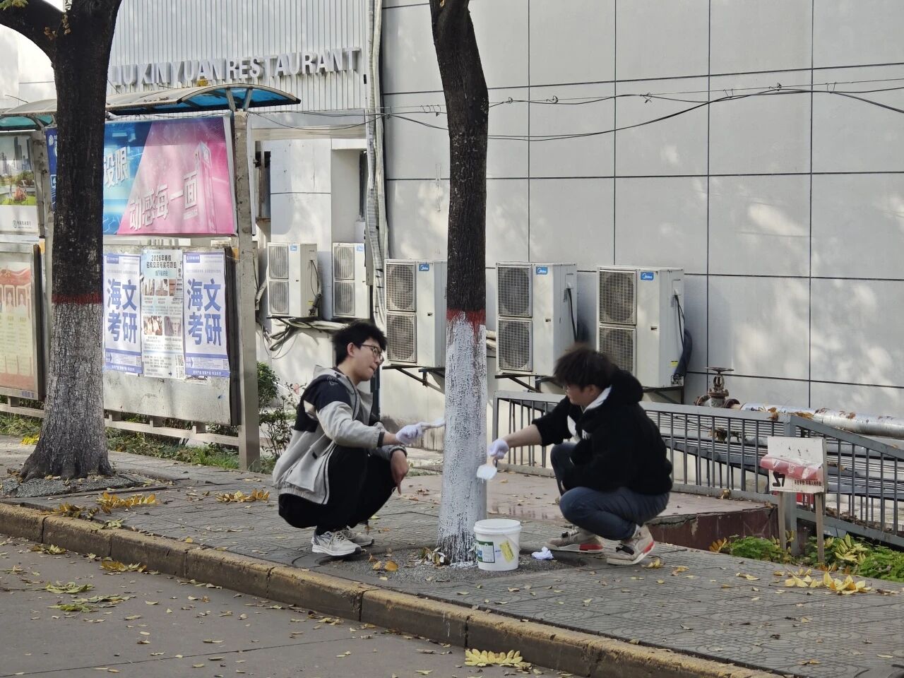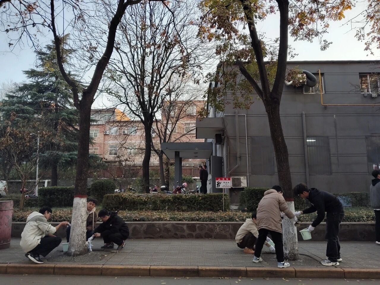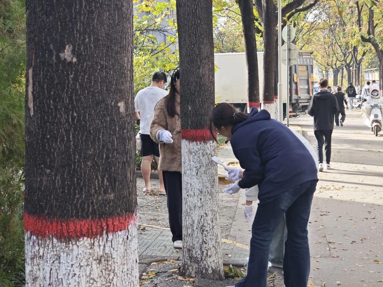 在望曦路南北两侧,同学们热情高涨,分工协作。有人负责标定基准线,确保涂白高度统一整齐;有人仔细清理树皮上的灰尘与虫卵;有人则专注地挥动刷子,将雪白的涂料均匀地粉刷至树干。现场一派热火朝天的劳动景象,成为冬日校园里一道温暖的风景。