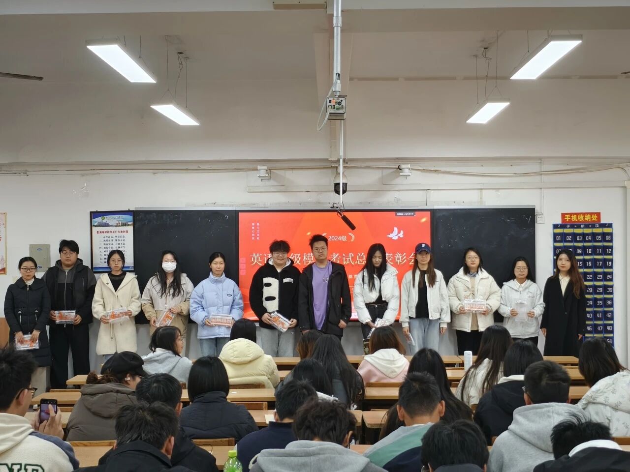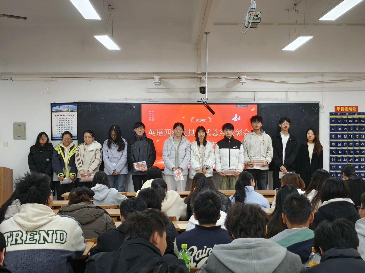 在随后的表彰环节中,大会对在两次模考中表现突出的“四级备考优胜个人”和“四级备考优胜班级”进行了表彰。段佳为获奖个人和集体颁发奖品,并鼓励同学们戒骄戒躁、再接再厉,争取在正式考试中再创佳绩。获奖名单如下: