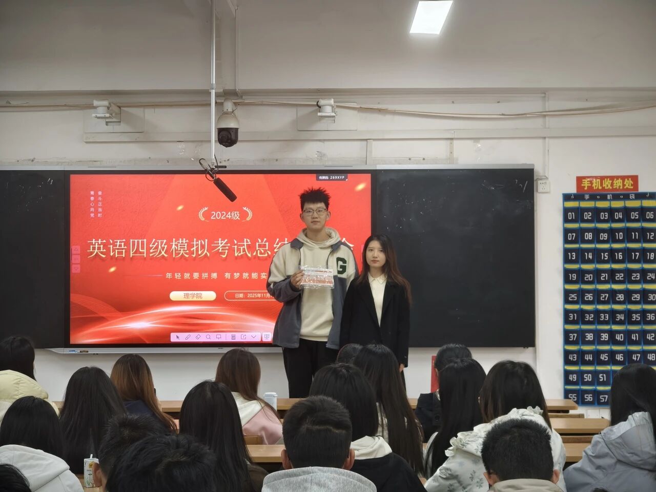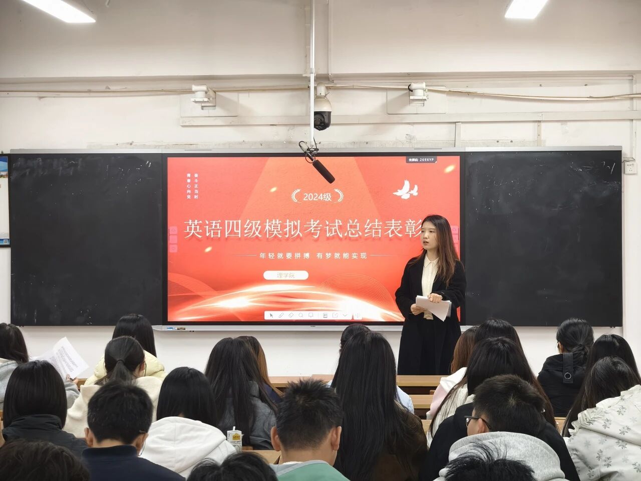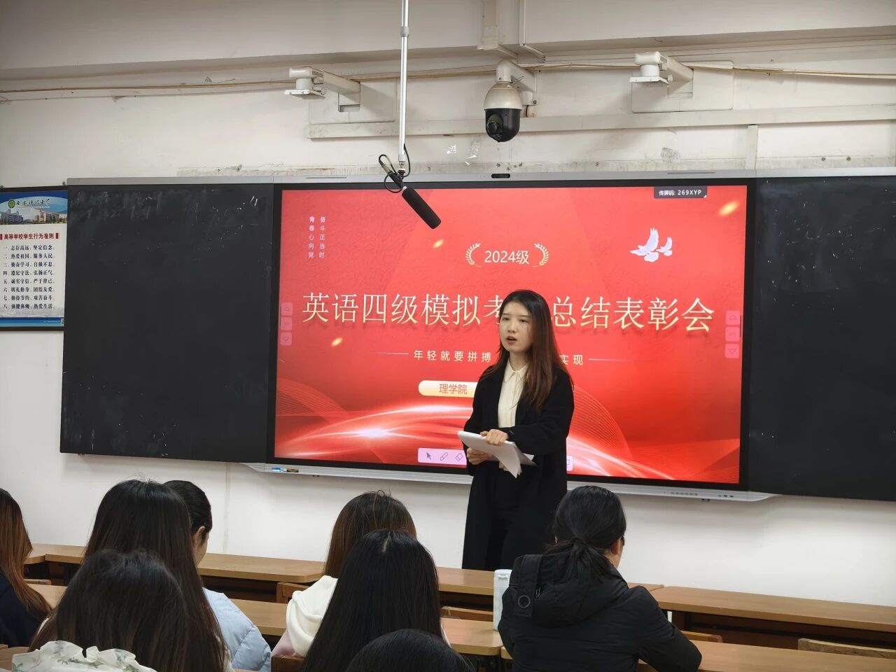 为总结备考经验、表彰先进典型,进一步激发学生的备考热情,11月26日,理学院于3-513教室组织召开了2024级第二次大学英语四级模拟考试表彰大会。本次大会由2024级辅导员段佳主持,2024级全体本科生参加。