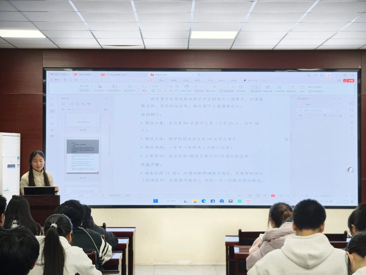 杨瑞欣首先阐述了本次帮扶活动的重要意义。她表示此次活动不仅是学院与长武县妇联校地合作的深化,更是学生骨干践行社会责任、传递温暖关怀的重要实践。通过“一对一”结对形式,能够为留守儿童提供持续的学业支持与心理陪伴,助力他们健康成长。