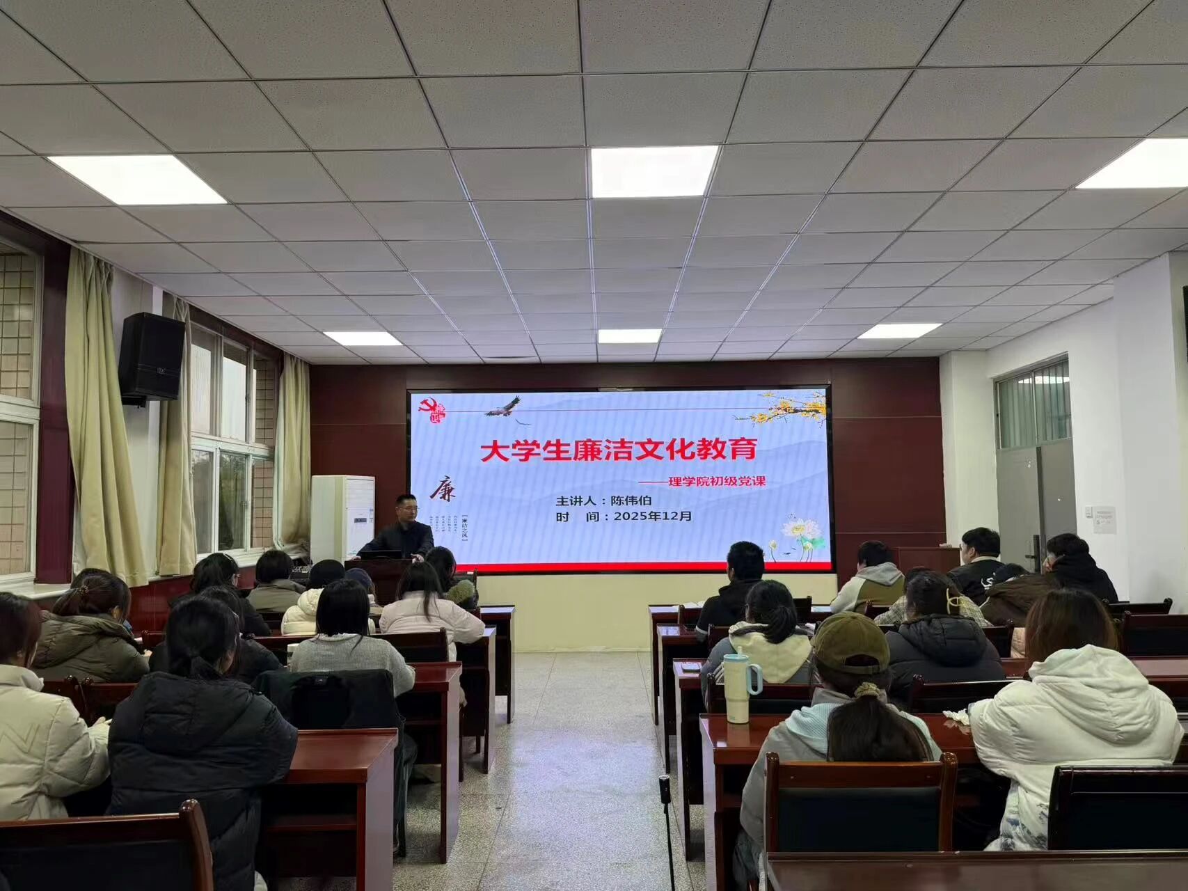 为进一步加强对学生入党积极分子的系统性培养、教育与考察,切实提升入党积极分子的政治素养、理论水平和思想觉悟。12月12日,理学院在220会议室举办2025年下半年入党积极分子培训班第一讲,本次培训由院党委副书记陈伟伯主讲,42名入党积极分子参会学习。