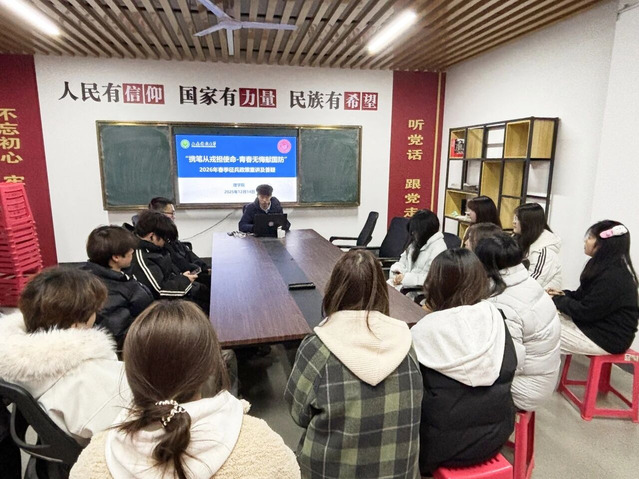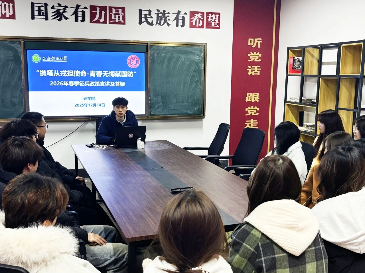 为积极响应国家征兵号召,鼓励青年学子投身国防事业,12月14日,理学院于“一站式”学生社区举行了2026年春季征兵政策宣讲及现场答疑活动。本次活动由院团委学生会办公室部长古致铮主持,面向2025级部分本科生进行政策解读与动员。