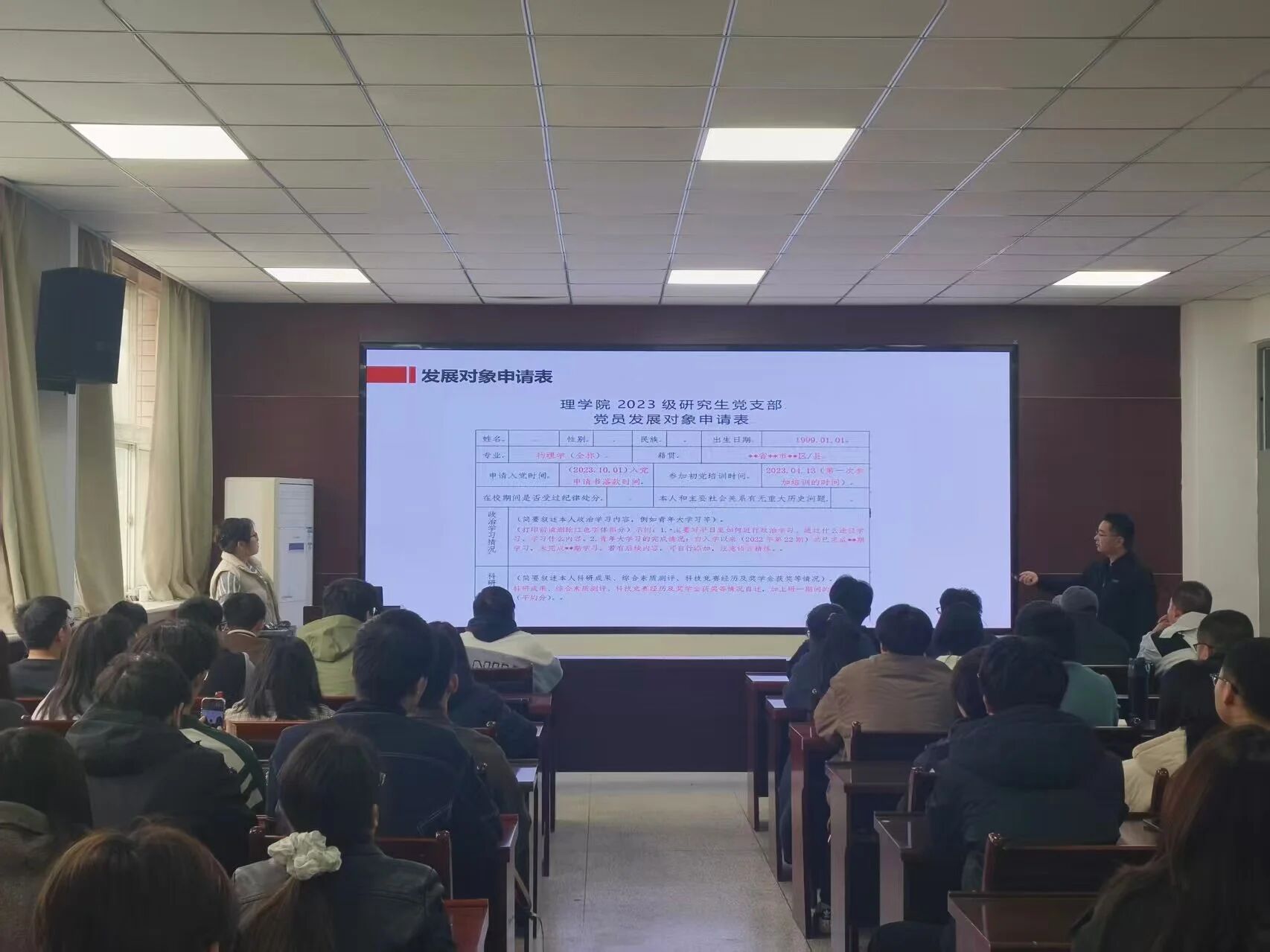 为规范党员发展工作,加强积极分子对入党流程的理解,12月16日,理学院于4-220会议室举办了入党积极分子培训第三讲。本次培训由本科生党支部书记薛一丹主持,院党委副书记陈伟伯出席,2025级全体研究生入党积极分子参加。