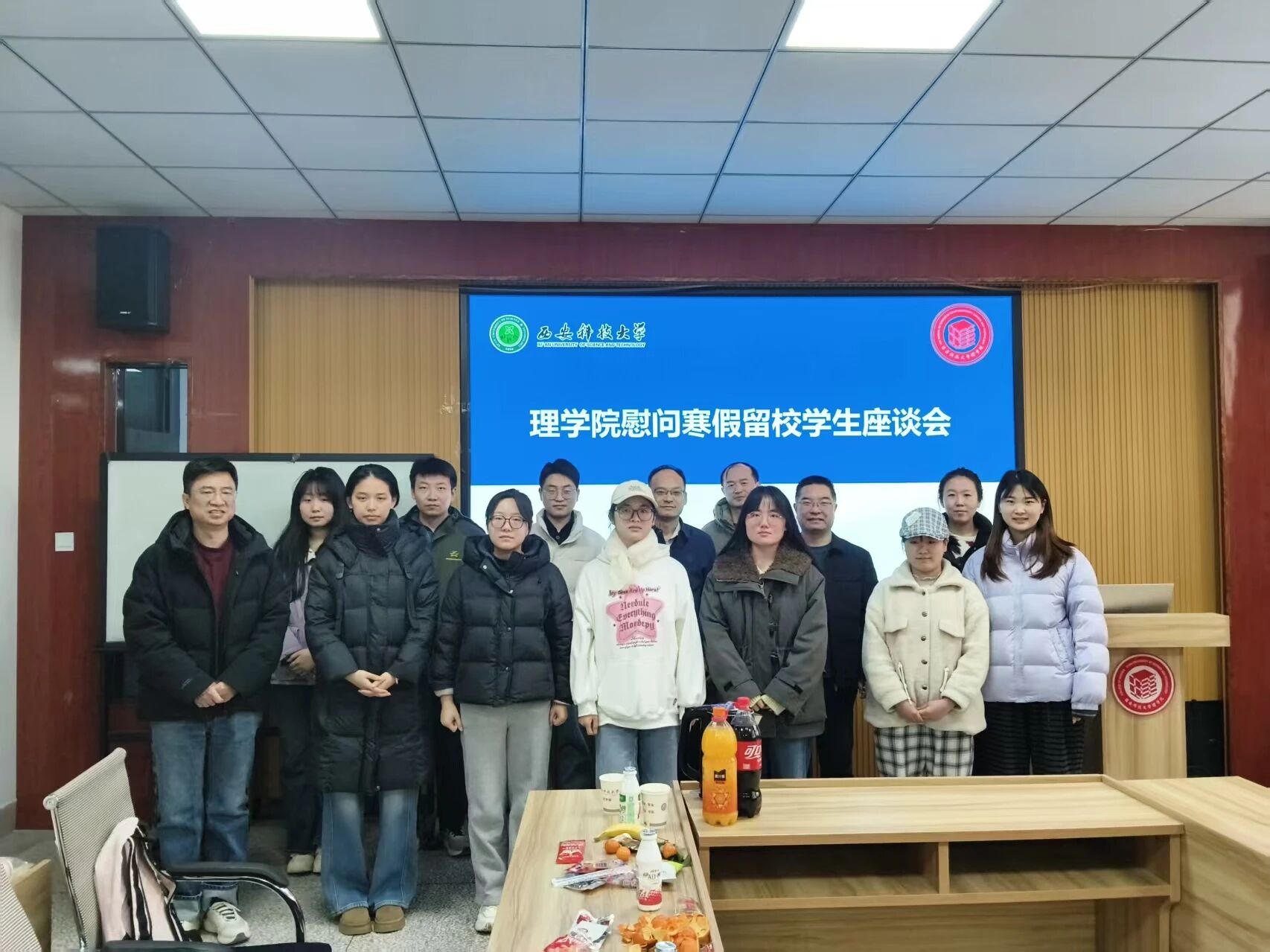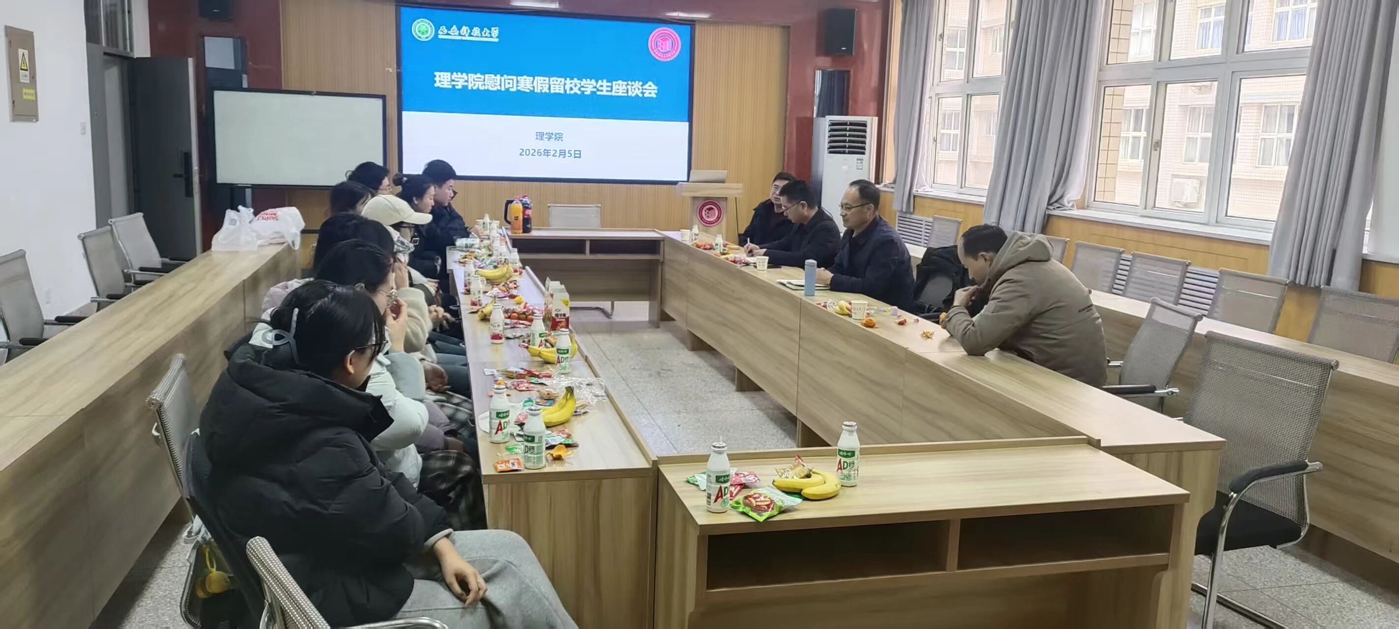 为深入了解留校学生的学习科研状况,送上学院的关怀与温暖,2月5日上午,理学院于208会议室召开了慰问寒假留校学生座谈会。理学院党委书记杨勇、党委副书记陈伟伯,实验中心主任刘伟、研究生导师代表庞华锋及16名留校学生参加座谈。会议由陈伟伯主持。座谈会上,留校学生依次汇报了寒假期间的学习科研安排。研一、研二学生重点介绍了论文撰写、科研项目进展及下一阶段任务规划;研三学生则详细汇报了求职就业进展情况。与会教师认真听取学生发言,并就相关问题进行互动交流。