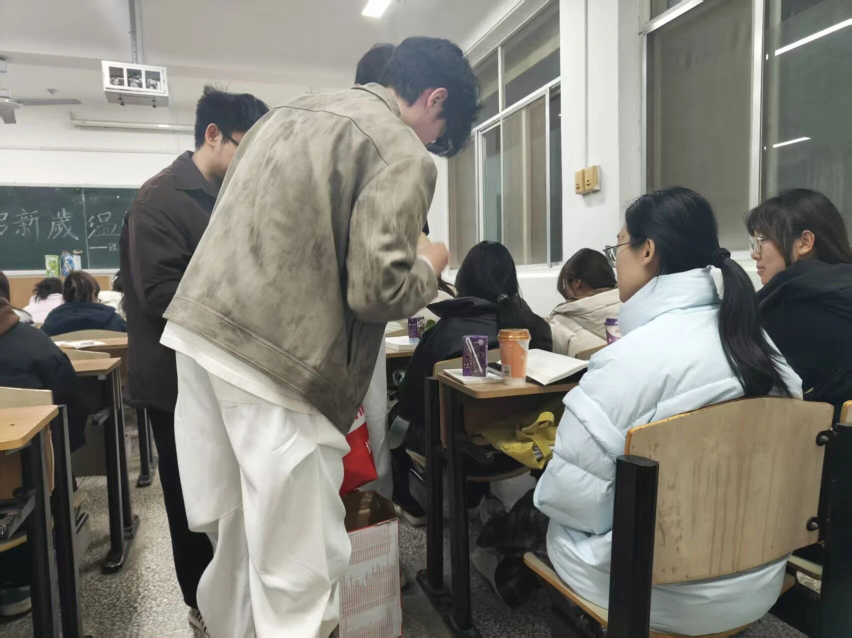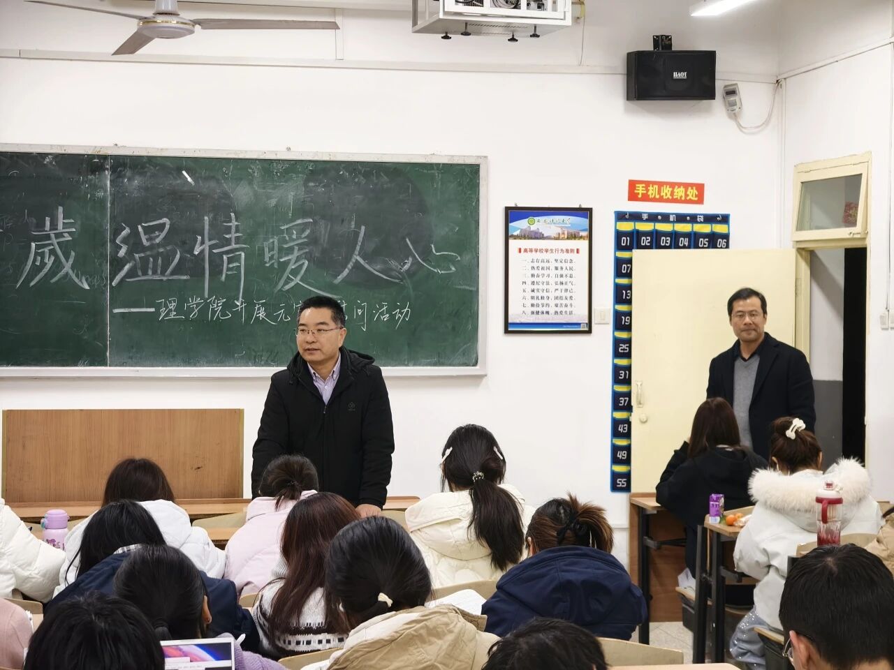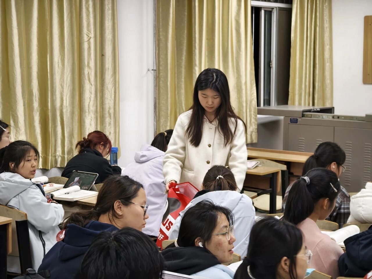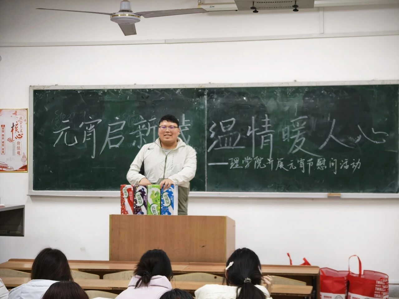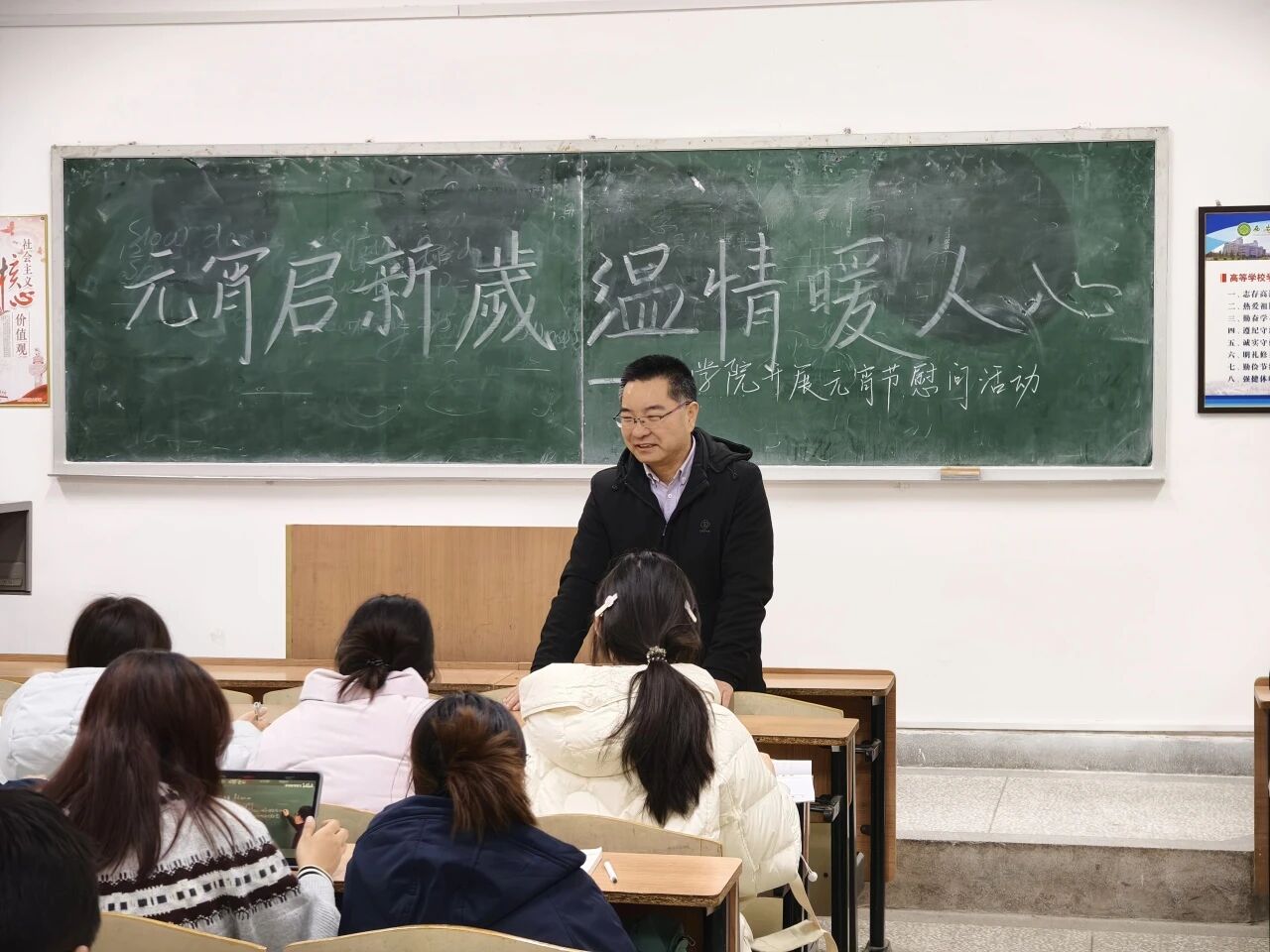 本科生慰问活动在学院一年级和二年级自习教室有序开展,两位老师及院团委学生会干部共同参与。院主席团成员姚如畅首先代表学生组织发言,向同学们致以节日祝福,并分享了自己在学院学习成长的感悟与收获,鼓励大家珍惜大学时光,在专业学习之余积极参与集体活动。
