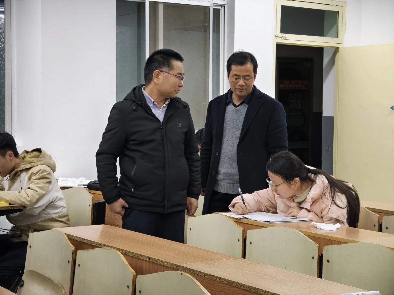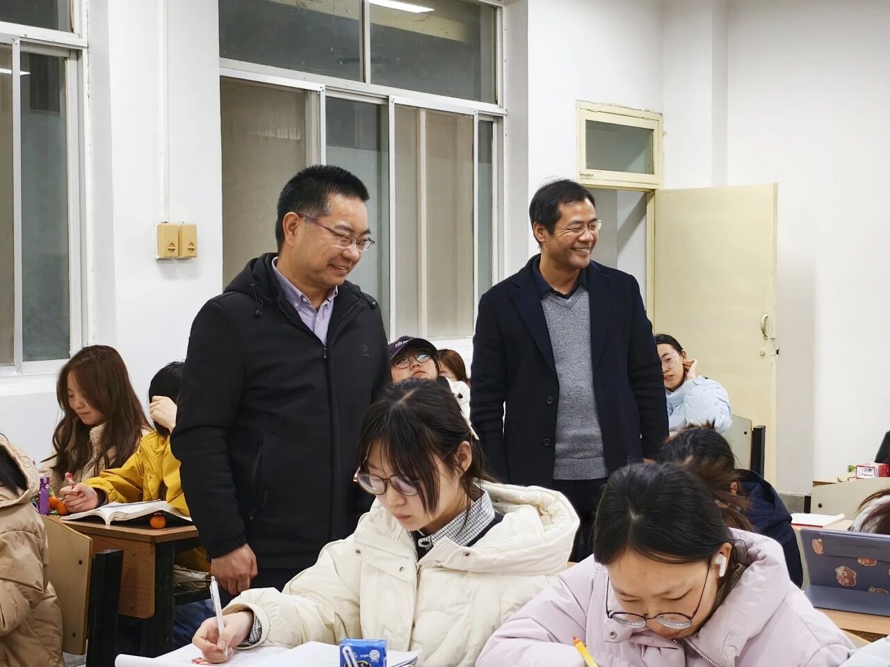 陈伟伯和侯斌刚一同走进各间教室,与同学们亲切交谈。他们仔细询问大家的学习生活情况,认真倾听同学们的心声与建议。在轻松愉快的氛围中,两位老师时而驻足观看同学们的学习状态,时而与正在自习的学生交流探讨,每到一处都留下了温暖的话语和真诚的鼓励。