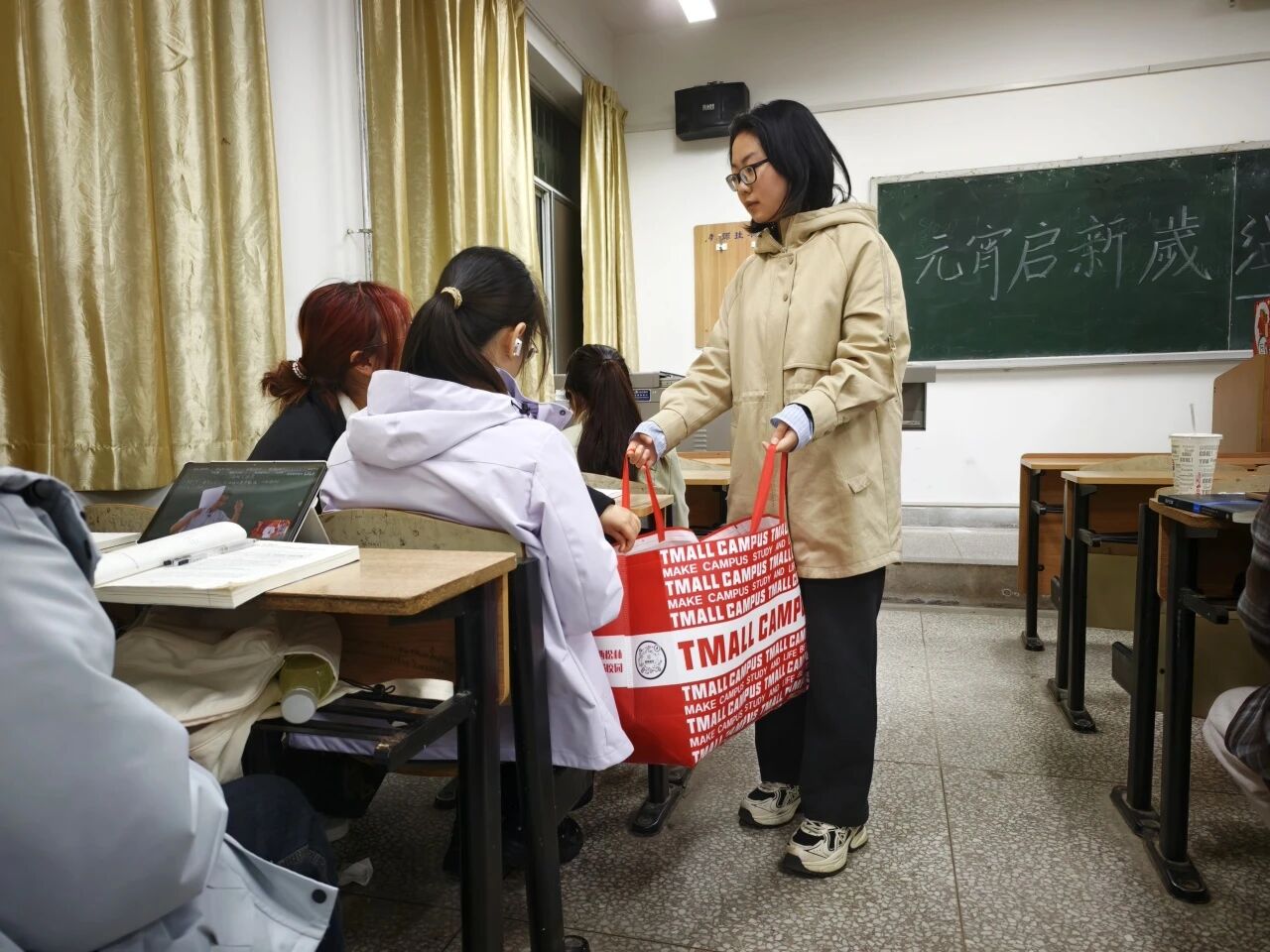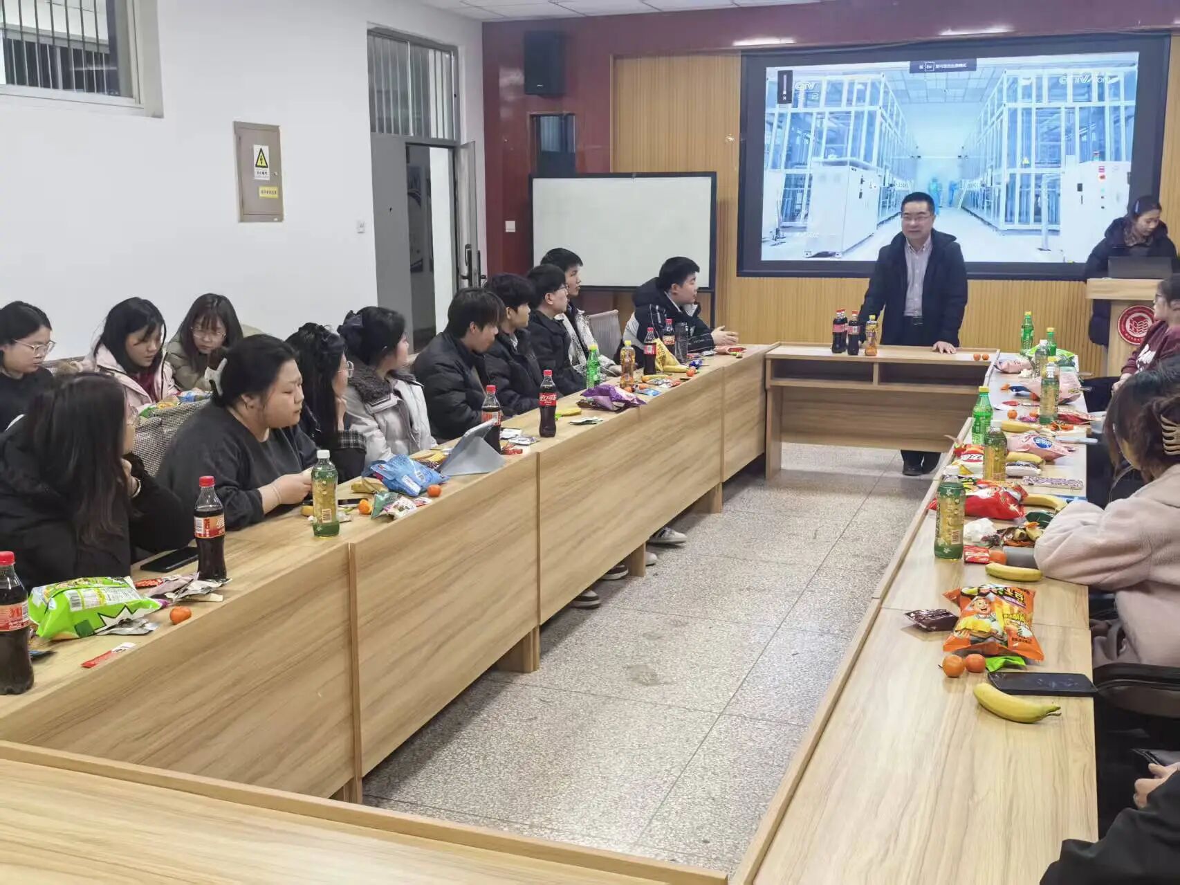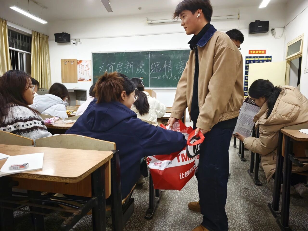 学生干部们将精心准备的零食、水果逐一送到每位同学手中。现场气氛热烈而温馨,同学们脸上洋溢着喜悦的笑容,纷纷表示感受到了学院大家庭的浓浓暖意。