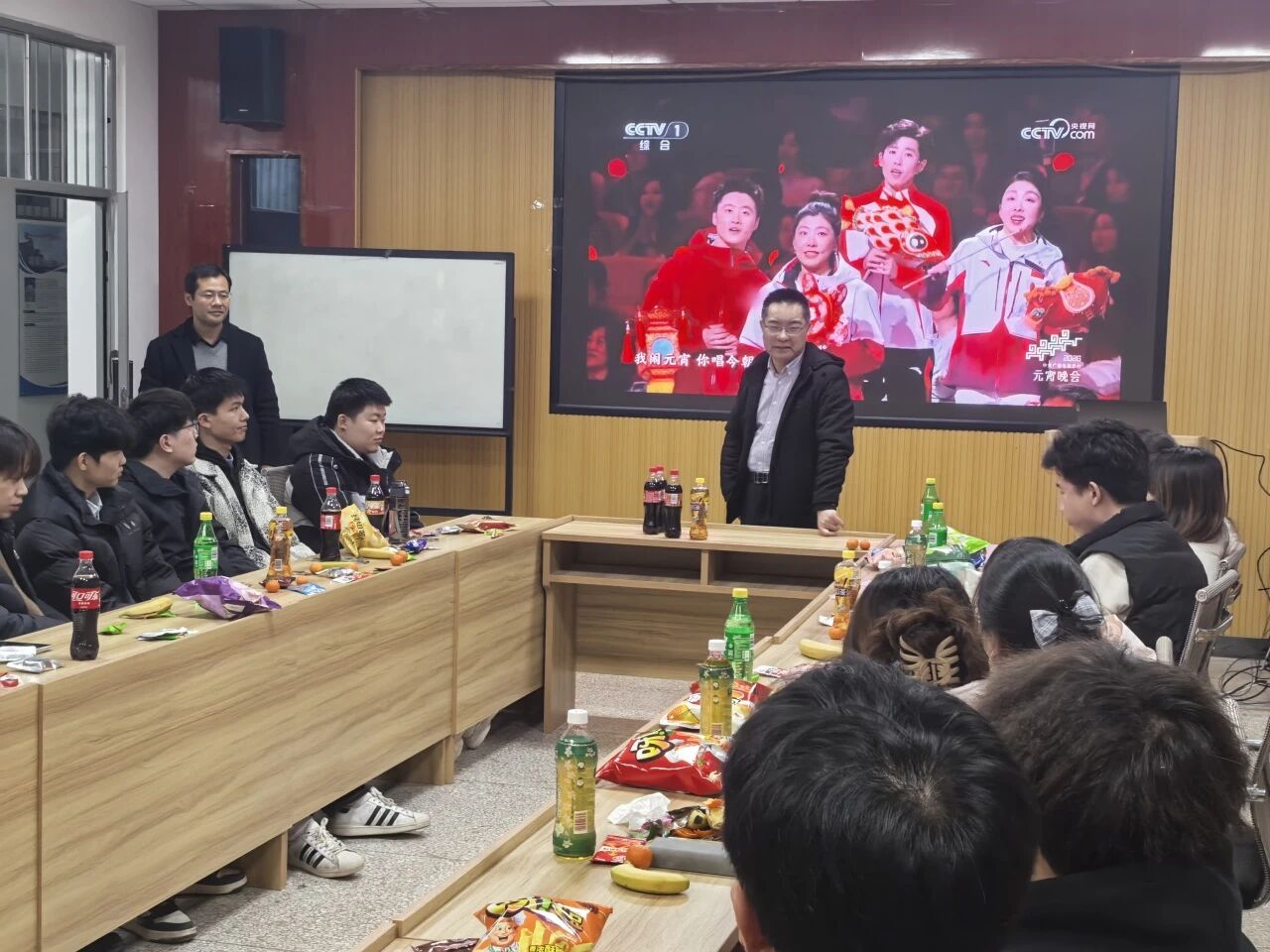 研究生慰问活动于学院208会议室举行。院党委副书记陈伟伯、学工办主任侯斌刚与同学们欢聚一堂,共同观看元宵晚会,在欢声笑语中感受传统节日的文化魅力。学院为同学们精心准备了零食、水果等节日慰问品,现场气氛轻松愉悦。