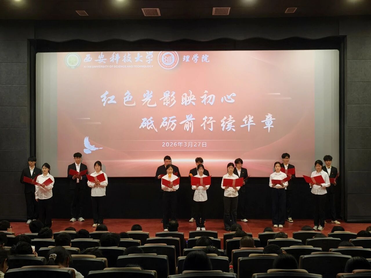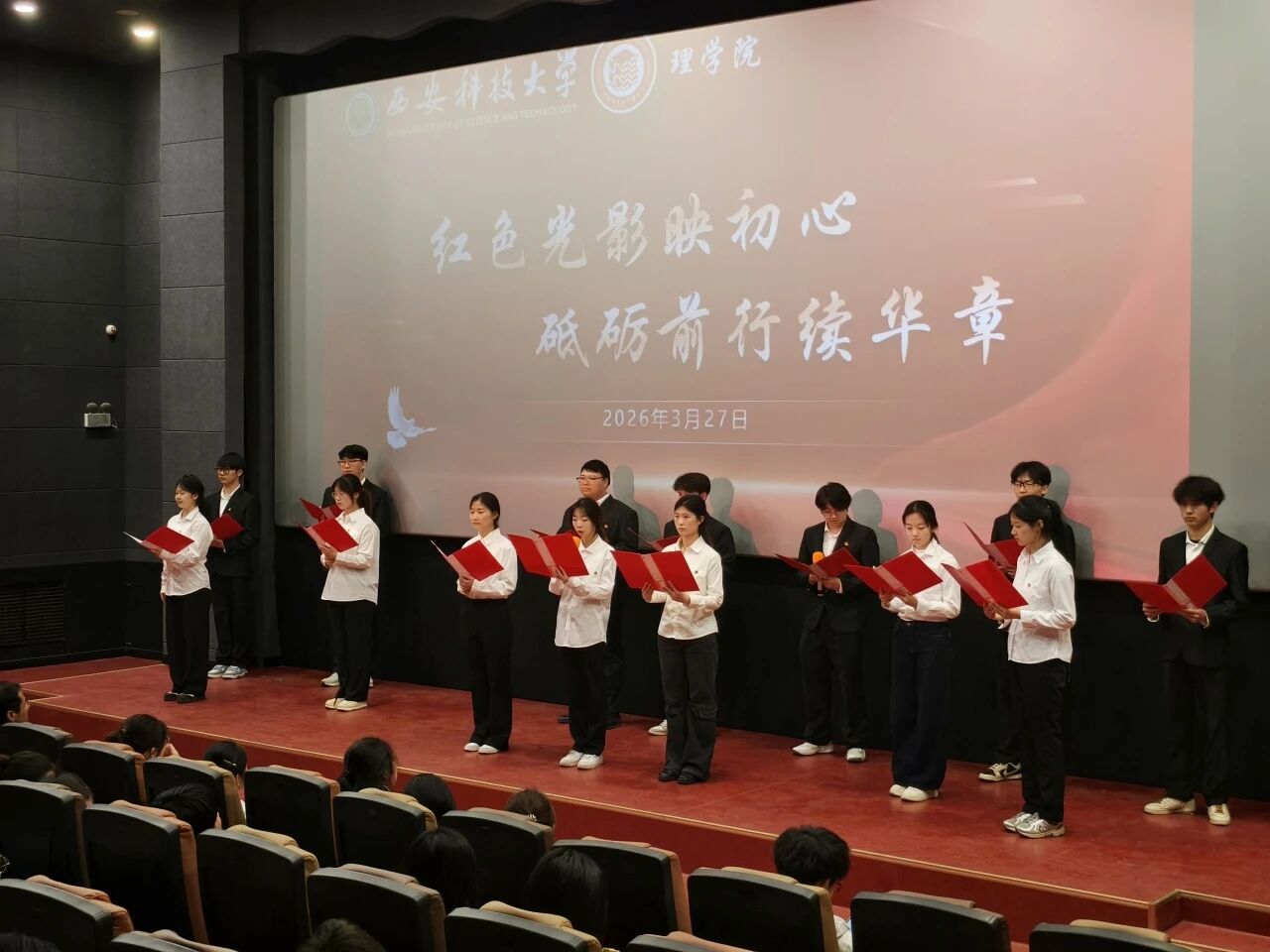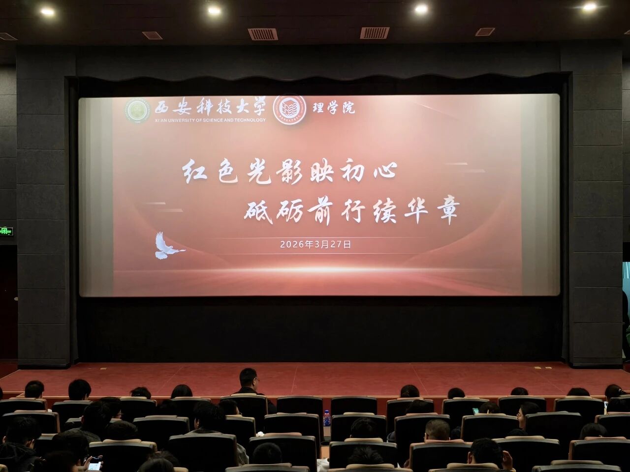 为深入学习贯彻习近平总书记关于“用好红色资源,赓续红色血脉”的重要指示精神,充分发挥优秀红色影视作品的育人功能,引导青年学子在光影中感悟初心使命、厚植爱国情怀,3月27日晚,理学院于煤炭科技中心4楼开展“红色光影映初心,砥砺前行续华章”爱国主义教育观影主题团日活动。院党委副书记陈伟伯、团委书记侯斌刚、2024级及2025级辅导员段佳、研究生辅导员薛一丹与学院全体团员共同参加。