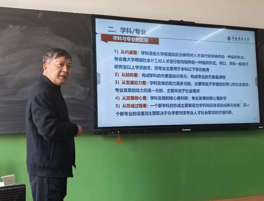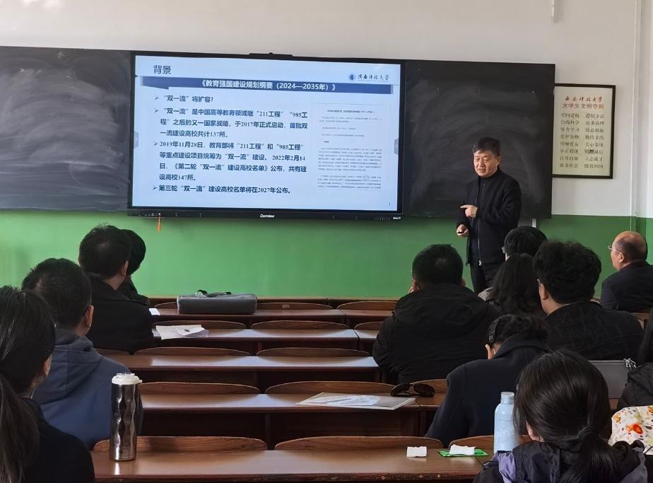 报告会上,刘建科教授首先介绍了陕西科技大学及该校物理学科的整体发展概况,随后围绕学科发展历程、学科与专业建设、博士学科建设进展、现存问题与发展思考四个维度,系统分享了陕科大物理学学科建设的实践路径与宝贵经验。他结合自身管理与教研经历,深入阐释学科建设的核心逻辑、关键抓手与实施策略,并就学科方向凝练、师资队伍建设、人才培养模式创新、科研成果转化等议题,与在场教师展开深度交流研讨。