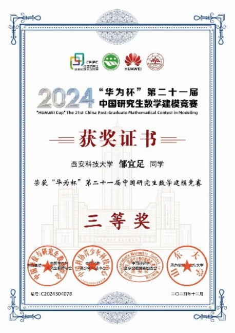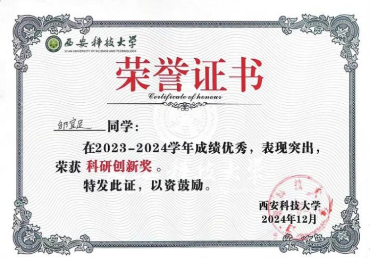 在竞赛活动和个人荣誉方面。2024年11月获得“华为杯第二十一届全国研究生数学建模竞赛”全国三等奖,2024年7月“第十二届全国大学生光电设计竞赛”西北区二等奖。通过参加竞赛,不仅提升了专业技能与实践能力,更培养了团队协作、抗压攻坚与持续创新的意识。在2024年12月获得西安科技大学“科研创新奖”个人荣誉。